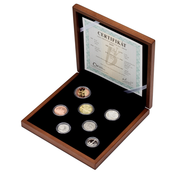 Komplet je doplněn číslovaným certifikátem pravosti, který vyrobila Státní tiskárna cenin, a uložen do elegantní dřevěné etue.