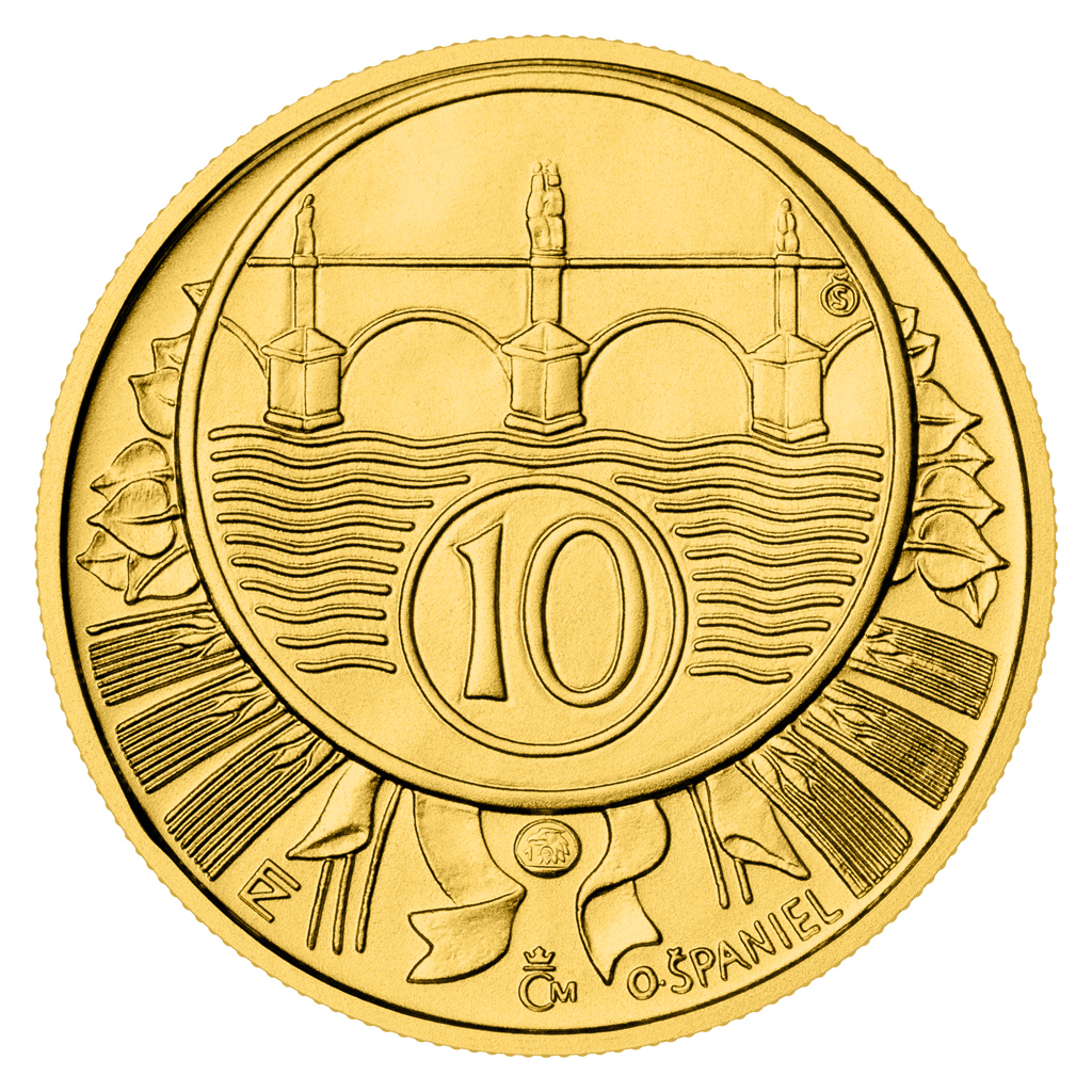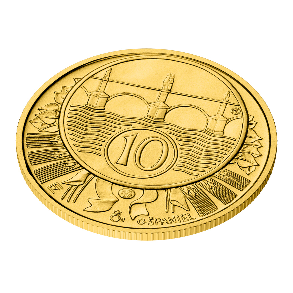 Druhý dukát zobrazuje motiv bývalého desetihaléře - Karlův most, Vltava a v kruhu číslice 10.