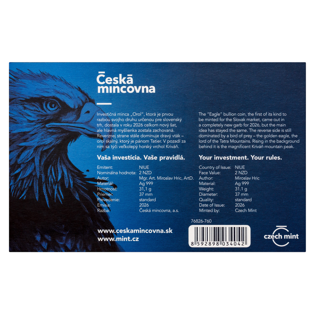 Světové investiční mince bývají věnovány silným národním symbolům a ani „Orol“, který je první ražbou svého druhu určenou pro slovenský trh, není výjimkou. Hmotnost stříbrné mince České mincovny s ročníkem 2026 činí jednu trojskou unci. Mince je číslována na hraně!