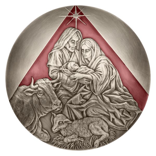 Motivem netradiční stříbrné pamětní medaile, která vyniká vypouklým tvarem, je tradiční betlém.