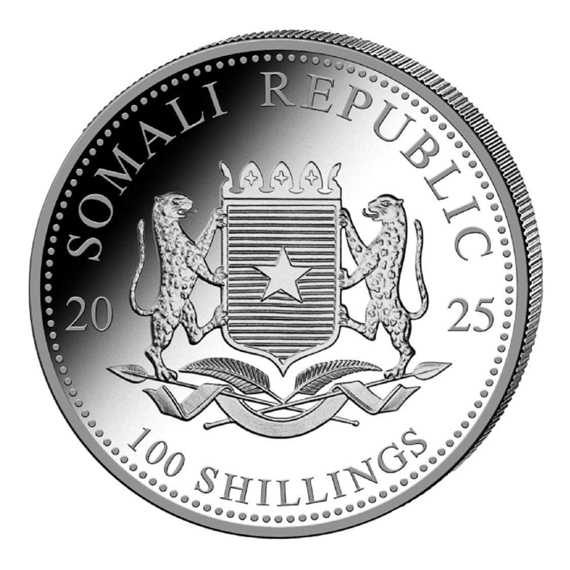 Stříbrná investiční mince Africká divočina Somálský slon 1 Oz je ražena z ryzího stříbra o ryzosti 999,9/1000, obsah stříbra je 31,1 gramu, nominální hodnota 100 SOS (somálských šilinků), průměr 38,70 mm, hrana vroubkovaná.