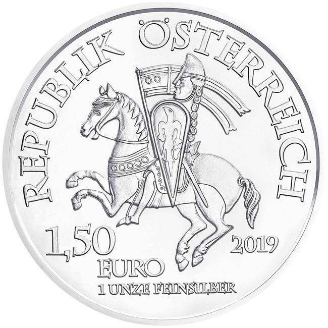 Nominální hodnota mince je 1,50 EURO, rok ražby 2019 a hmotnost mince 1 UNZE FEINSILBER. Kolem horního okraje je nápis REPUBLIK ÖSTERREICH.