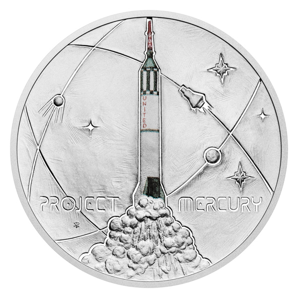 Reverzní stranu mince věnoval medailér Asamat Baltaev, DiS., startující americké raketě Mercury‑Redstone 3, která je díky technologii kolorování vyobrazena v autentických barvách. Kompozici dotvářejí stylizované vesmírné objekty – planeta, hvězdy i plavidla – a anglický nápis PROJECT MERCURY. Averzní strana mince pak vtipně předkládá kruhy v obilí a létající talíř, který osvětluje státní znak ostrova Niue. Ten je spolu s letopočtem emise 2024 a nominální hodnotou 1 DOLLAR (NZD) nezbytným atributem zahraničního emitenta mince – tichomořského ostrova, který České mincovně poskytuje licenci k ražbě vlastních pamětních mincí.
