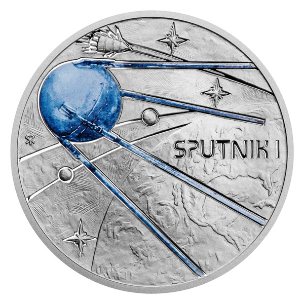 Třetí stříbrná mince ze sběratelské série Mléčná dráha je věnována prostředku, který poslal lidstvo do kosmického věku – družici jménem Sputnik 1.