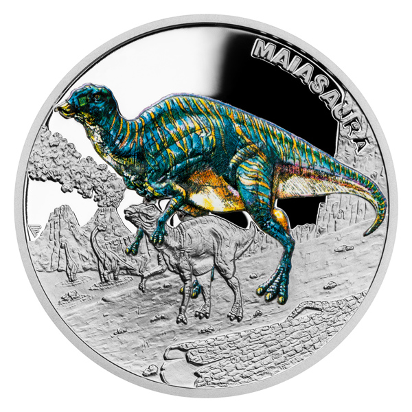 Šestým druhohorním ještěrem, který se objevuje na stříbrné minci České mincovny z cyklu Pravěký svět, je maiasaura.