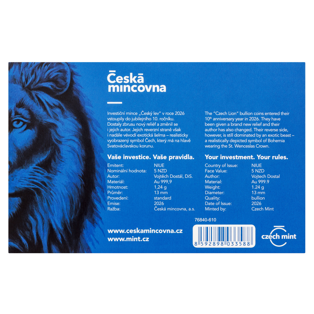 Investiční mince v roce 2026 vstoupily do jubilejního 10. ročníku. Dostaly zbrusu nový reliéf a změnil se i jejich autor, ale jejich reverzní straně i nadále vévodí dvouocasý český lev – realisticky vyobrazený symbol národa, který má na hlavě Svatováclavskou korunu. Kráčející šelma je dílem zkušeného medailéra Vojtěcha Dostála, DiS. Protože mince České mincovny vycházejí v licenci zahraničního emitenta, kterým je ostrov Niue, jejich averzní strana nese jeho nezbytné atributy – portrét krále Karla III., nominální hodnotu 5 DOLLARS (NZD) a rok emise 2026.
