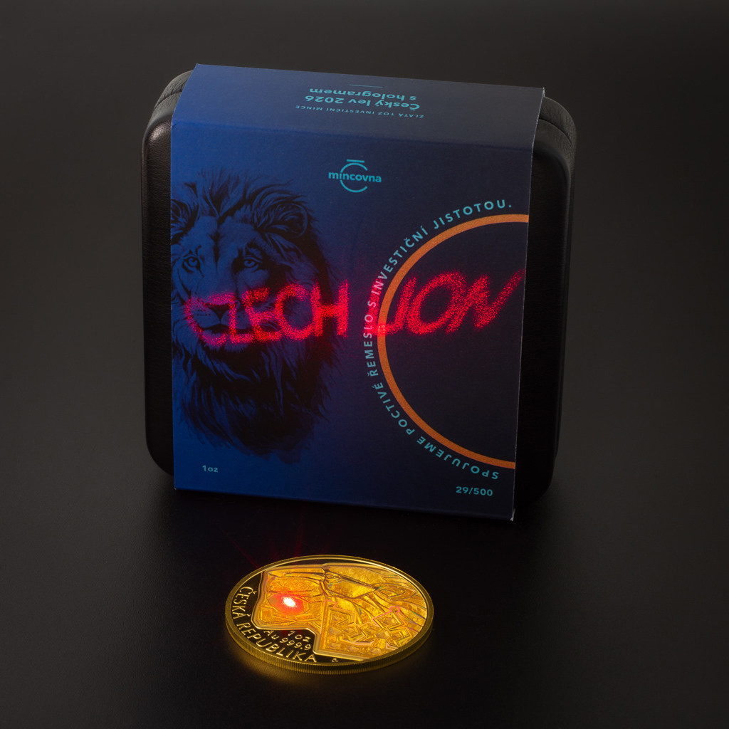 V roce 1999 v České republice vznikl světový unikát – první mince s holografickou ražbou do ryzího zlata. Jednalo se o bimetalovou pamětní minci, kterou pro Českou národní banku u příležitosti konce druhého tisíciletí vyrobila Česká mincovna. Tehdy šlo o ražbu jednoduchých binárních mikrostruktur, avšak dnešní technologie je na nesrovnatelně vyšší úrovni. Na světě je v současnosti jen několik málo pracovišť, která umí navrhnout a vyrobit nebinární holografické struktury. Ještě méně společností pak vyniká v kvalitě masteringu a preciznosti produkce. Na samé špici stojí česká firma IQ Structures, která v roce 2020 ve spolupráci s Českou mincovnou vytvořila bezpečnostní hologram „Czech Security Check“. Ten chrání vybrané mince z řady „Český lev" před paděláním. Protože hologramy nejsou jen prvkem ochranným, ale také okrasným, obě společnosti se v letech 2023 a 2026 rozhodly jít ještě dál. Namísto malého kousku věnovaly raženému hologramu značnou část reverzní strany mince. Přestože hologram působí velmi plasticky, nenechte se zmást. Je totiž prakticky plochý a nelze ho nahmatat. Motiv je tvořen mikroskopickými reliéfy s detailem začínajícím v řádu nanometrů – čili miliardtin metru. To je tisíckrát méně než tloušťka lidského vlasu! Mince s ročníkem 2026 navíc ukrývá vzkaz, který lze odhalit jenom s použitím laserového ukazovátka…