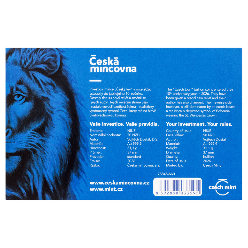 Investiční mince v roce 2026 vstoupily do jubilejního 10. ročníku. Dostaly zbrusu nový reliéf a změnil se i jejich autor, ale jejich reverzní straně i nadále vévodí dvouocasý český lev – realisticky vyobrazený symbol národa, který má na hlavě Svatováclavskou korunu. Kráčející šelma je dílem zkušeného medailéra Vojtěcha Dostála, DiS. Protože mince České mincovny vycházejí v licenci zahraničního emitenta, kterým je ostrov Niue, jejich averzní strana nese jeho nezbytné atributy – portrét krále Karla III., nominální hodnotu 50 DOLLARS (NZD) a rok emise 2026.