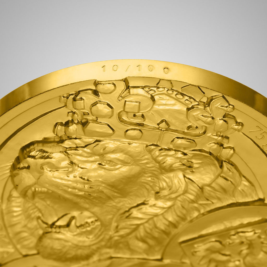 Představujeme vám mimořádnou edici investiční mince Český lev, která zaujme číslováním na hraně a výrazným vysokým reliéfem. Větší hloubka plastiky umožnila upravit podobu lva tak, že má – na rozdíl od ostatních mincí s ročníkem 2025 – otevřenou tlamu. Řvoucí lev je vyražen ze dvou trojských uncí ryzího zlata.