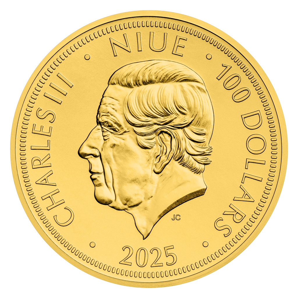 Averzní strana nese atributy ostrova Niue, jenž je zahraničním emitentem mince. Najdeme na ní portrét krále Karla III., nominální hodnotu 100 DOLLARS (NZD) a rok vydání 2025.