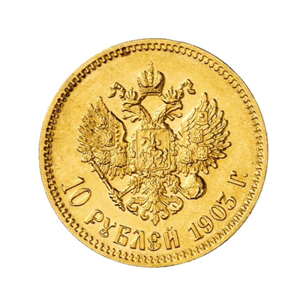 Averzní strana mince zobrazuje carský erb, ve spodní části je uveden nápis 10 РYБЛЕЙ a rok ražby 1903.