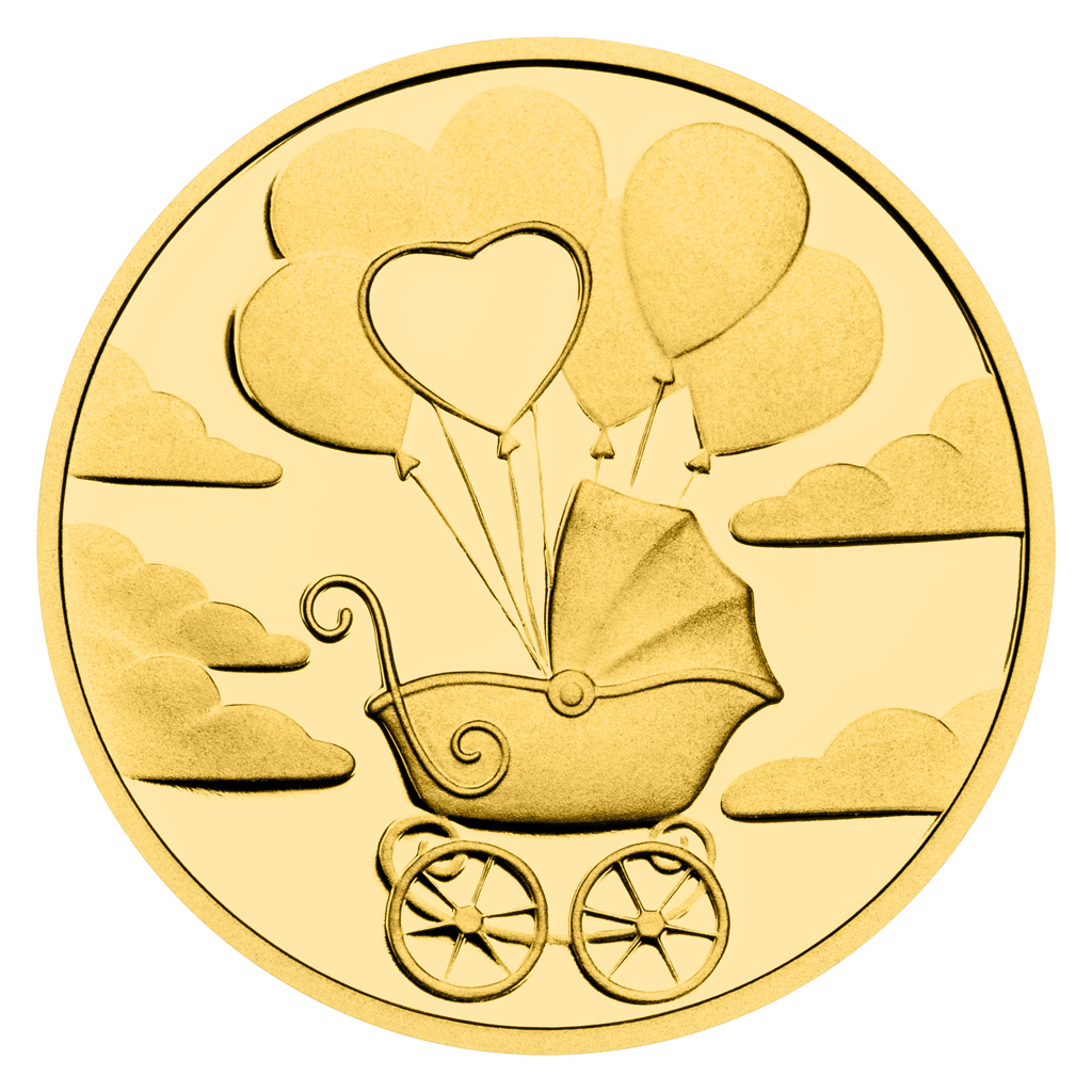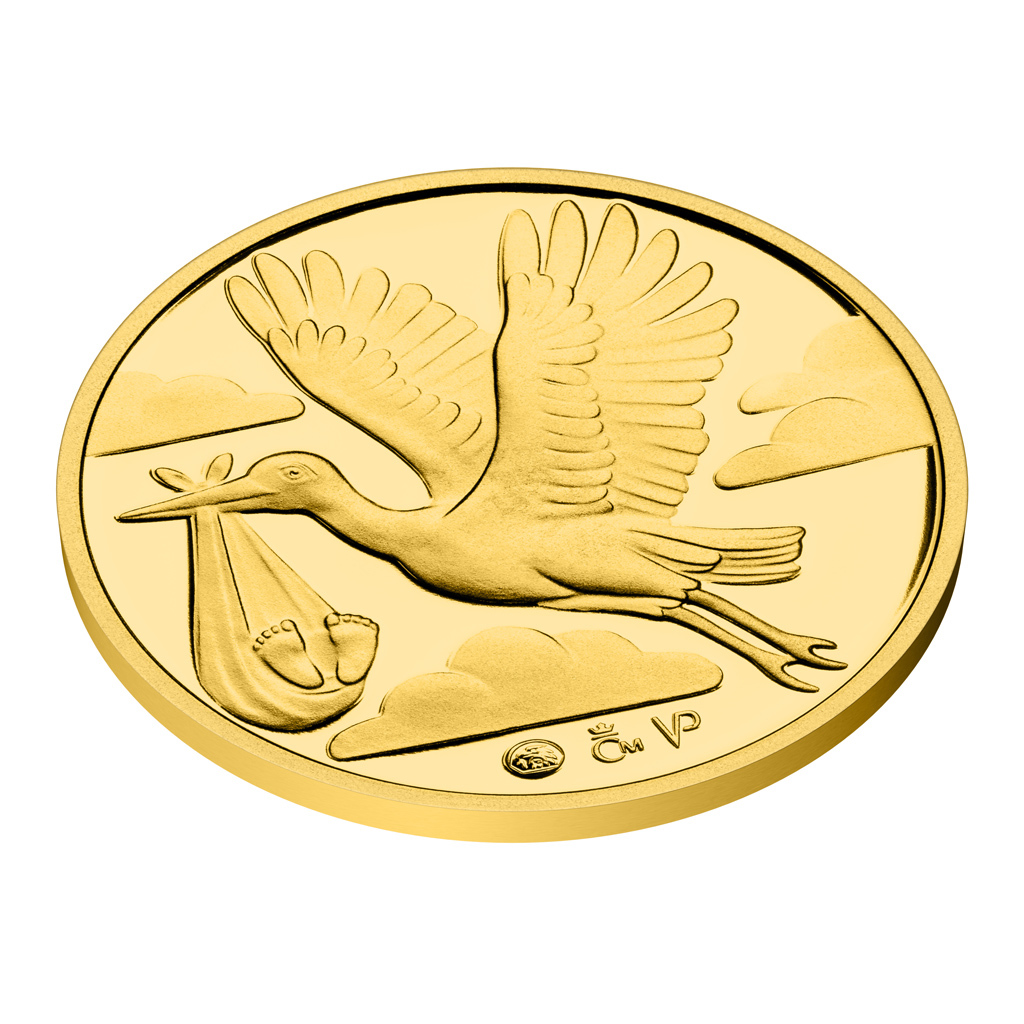 Čápovi, který v zobáku nese uzlíček, věnovala medailérka Veronika Prokopová, DiS., reverzní stranu zlatého dukátu. Averzní strana pak předkládá letící kočárek, který nadnášejí balonky.