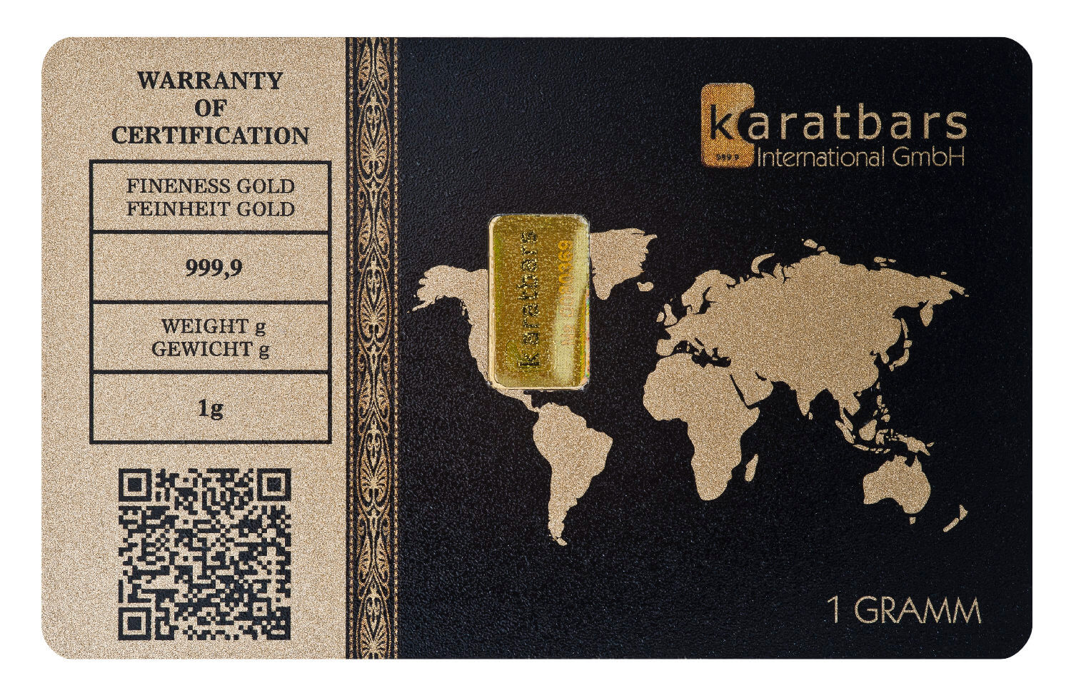 Slitek je umístěn uprostřed plastového blistru o velikosti bankovní karty. Na obou jeho stranách jsou v tabulce uvedeny technické údaje o slitku v anglickém a německém jazyce: FINENESS GOLD FEINHEIT GOLD 999,9, WEIGHT g GEWICHT g 1g. Tabulka s údaji je nadepsána WARRANTY OF CERTIFICATION. Nechybí údaj LBMA GOLD a QR kód odkazující na stránky německé společnosti Karatbars International.