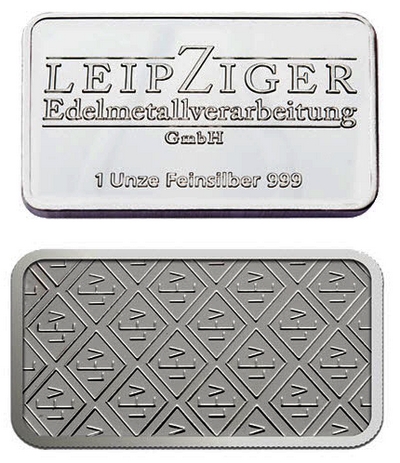 Stříbrný slitek Leipziger Edelmetallverarbeitung 1 Oz je vyražen ze stříbra o ryzosti 999/1000 a obsahuje 31,1 gramu stříbra.