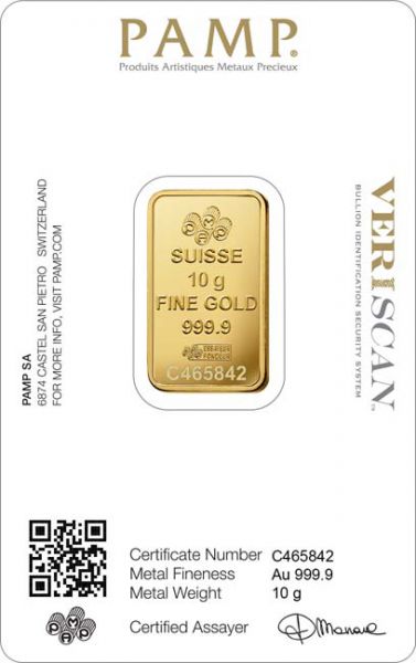 Zlatý investiční slitek PAMP Fortuna 10 g je vyražen ze zlata o ryzosti 999,9/1000 (24 karátů), obsah zlata je 10 gramů.